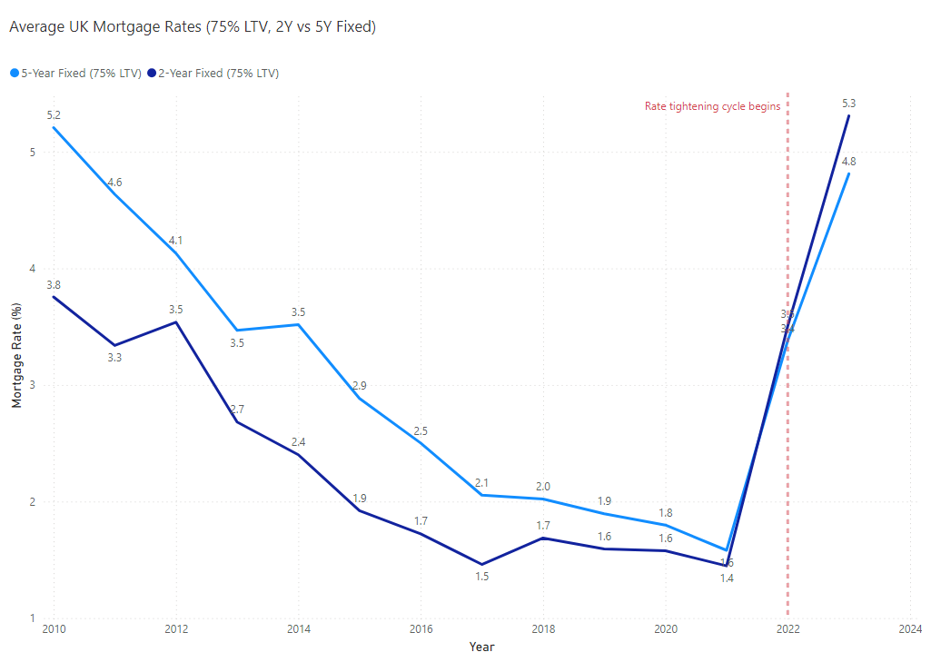 Office for National Statistics (UK House Price Index, Average Earnings, Private Rental Market Statistics); Bank of England (Quoted Household Mortgage Rates, 75% LTV 2-year and 5-year fixed)