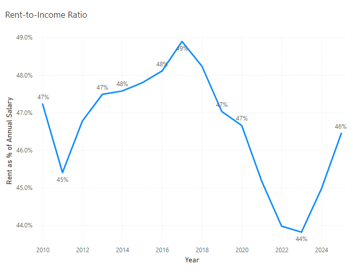 Rent has consumed between 45% and 49% of annual income for most, between 2010 and 2025.