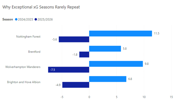 Large positive deviations, especially those exceeding +5 goals, were rare at the full-season level. Where they did exist, they were typically associated with elite attacking quality or an exceptional finishing season that’s difficult to repeat.